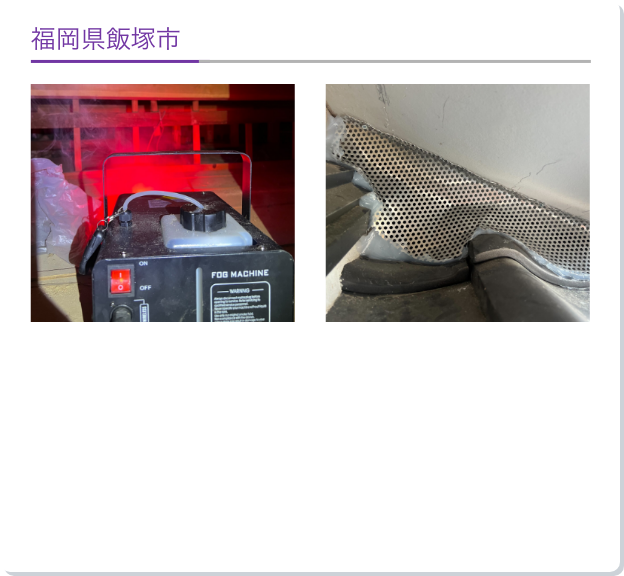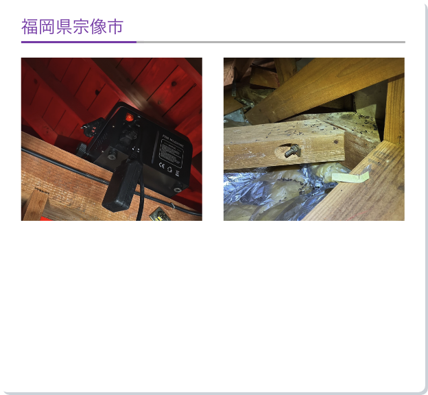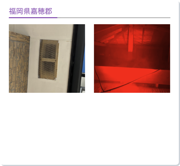 福岡県嘉穂郡でイタチ、ネズミ、コウモリによる被害を解消するため、天井裏の糞害を確認し、徹底的に糞清掃を行いました。さらに外部の侵入口を封鎖し、追い出し作業を行いました。最後にウイルス殺菌やノミダニ駆除のための薬剤を噴霧し、工事を完了しました。