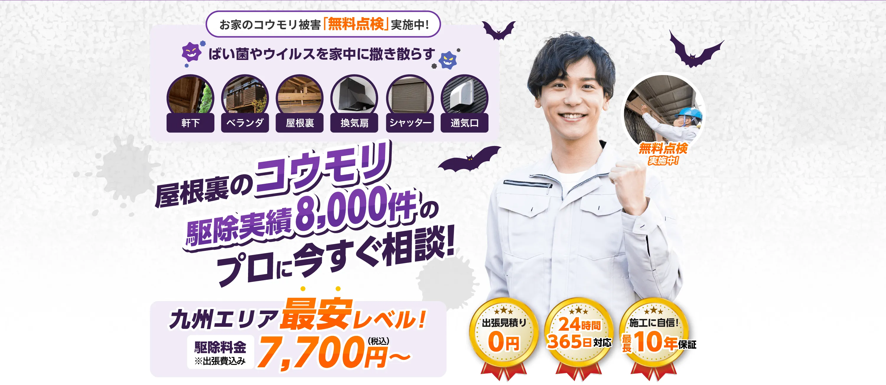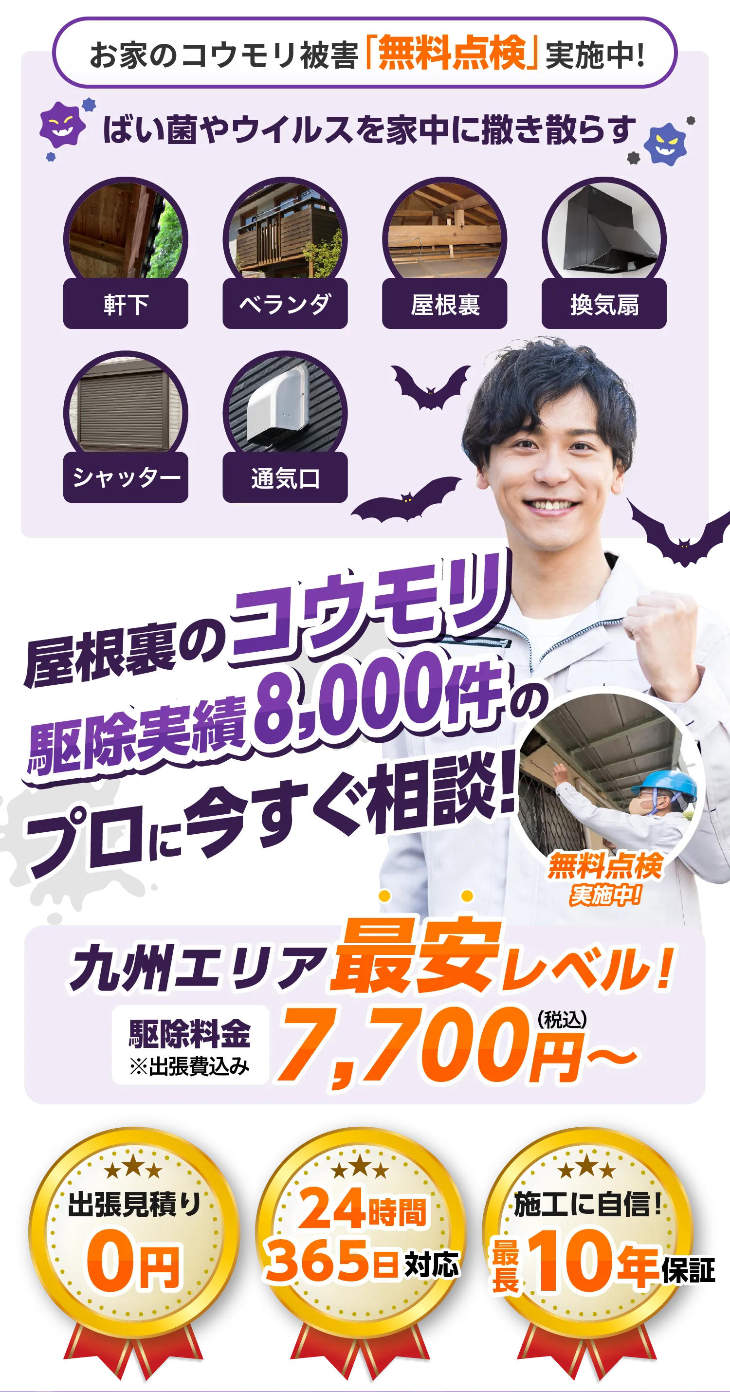 九州エリアのコウモリトラブルに即日対応。急なご依頼にも無料出張。お電話から最短20分で到着いたします。