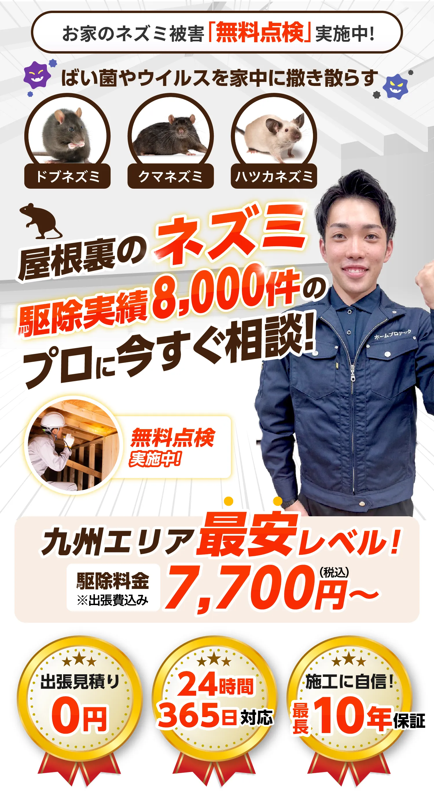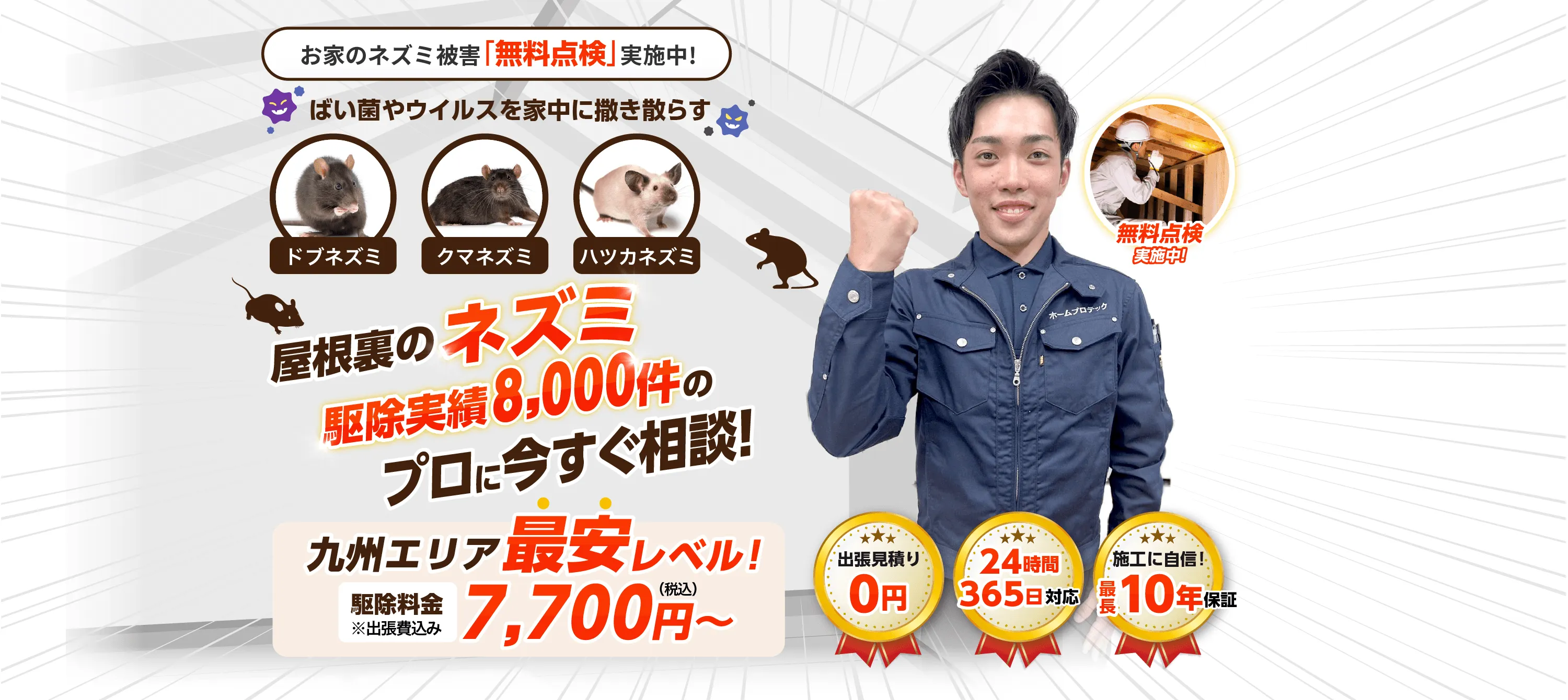 九州エリアのネズミトラブルに即日対応。急なご依頼にも無料出張。お電話から最短20分で到着いたします。